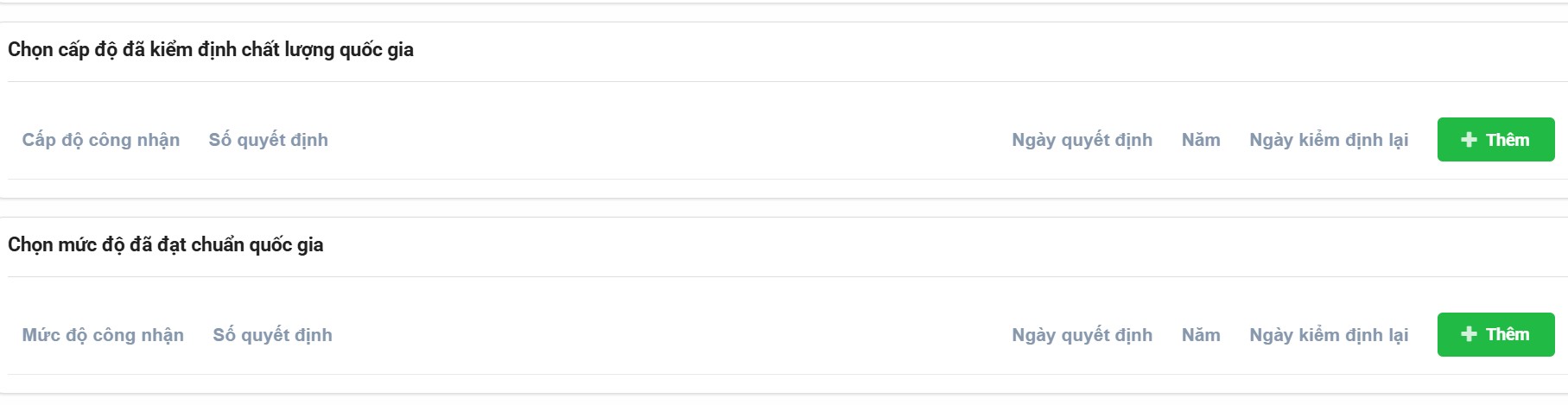 - Nếu trường đã được công nhận đạt chuẩn quốc gia, bấm Thêm để nhập thông tin theo từng năm.