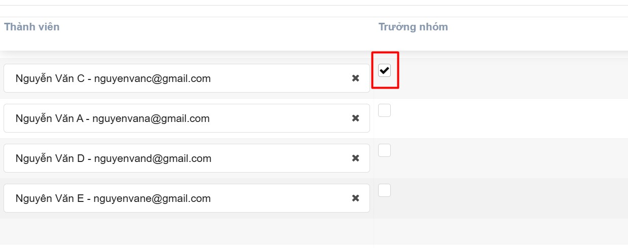 Bước 7: Để phân công Trưởng nhóm, tích chọn vào ô Trưởng nhóm tại tên thành viên tương ứng