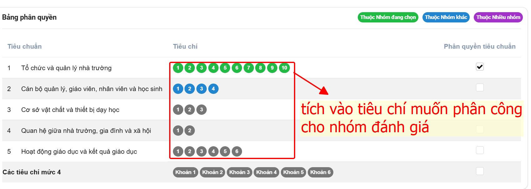 - Chỉ tài khoản quản trị mới có quyền tạo nhóm và phân công tiêu chí