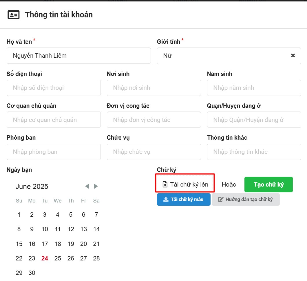 - Chữ ký sau khi cập nhật sẽ được sử dụng để ký số trong các báo cáo, phiếu đánh giá, minh chứng,… theo đúng quyền hạn đã được phân quyền