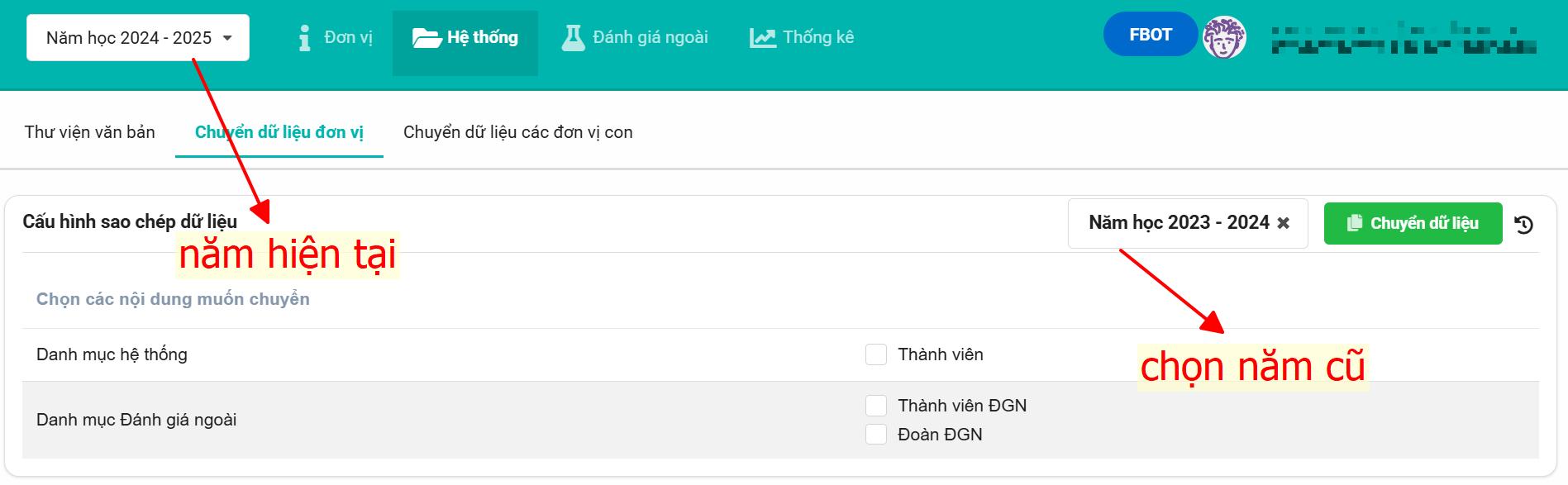 Bước 2: Chọn năm cũ – tức năm học đã có dữ liệu đầy đủ mà Thầy/Cô muốn sao chép sang năm hiện tại