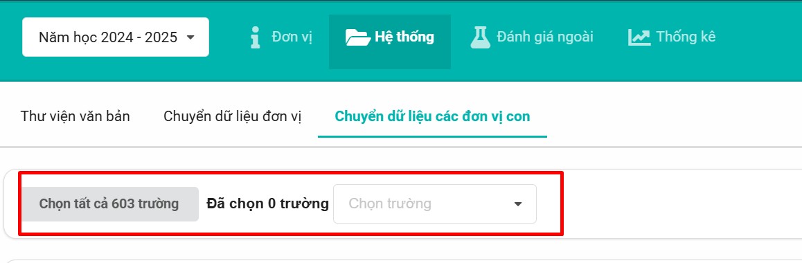 Bước 1: Vào menu Hệ thống → chọn tab Chuyển dữ liệu các đơn vị con