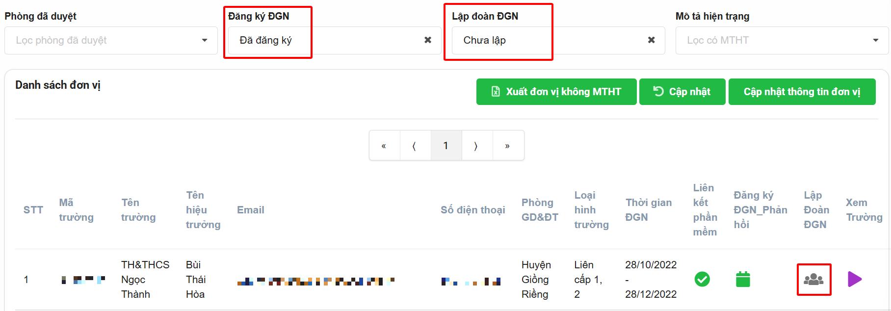 Bấm vào nút Lập đoàn ĐGN (nút màu đen là chưa lập đoàn, màu xanh lá là đã lập).