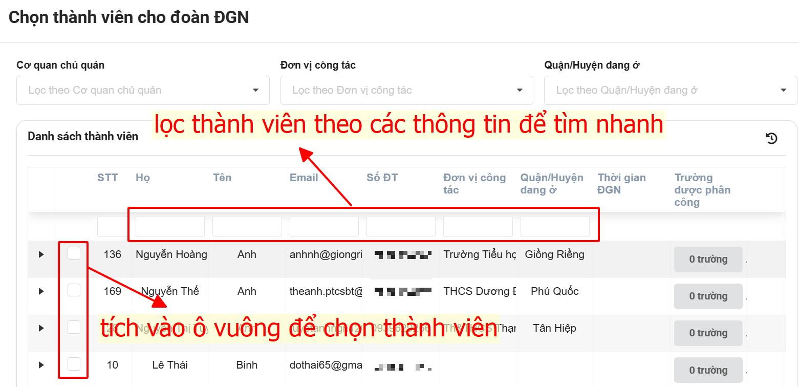 → Tích chọn vào ô vuông trước tên thành viên để thêm vào đoàn.