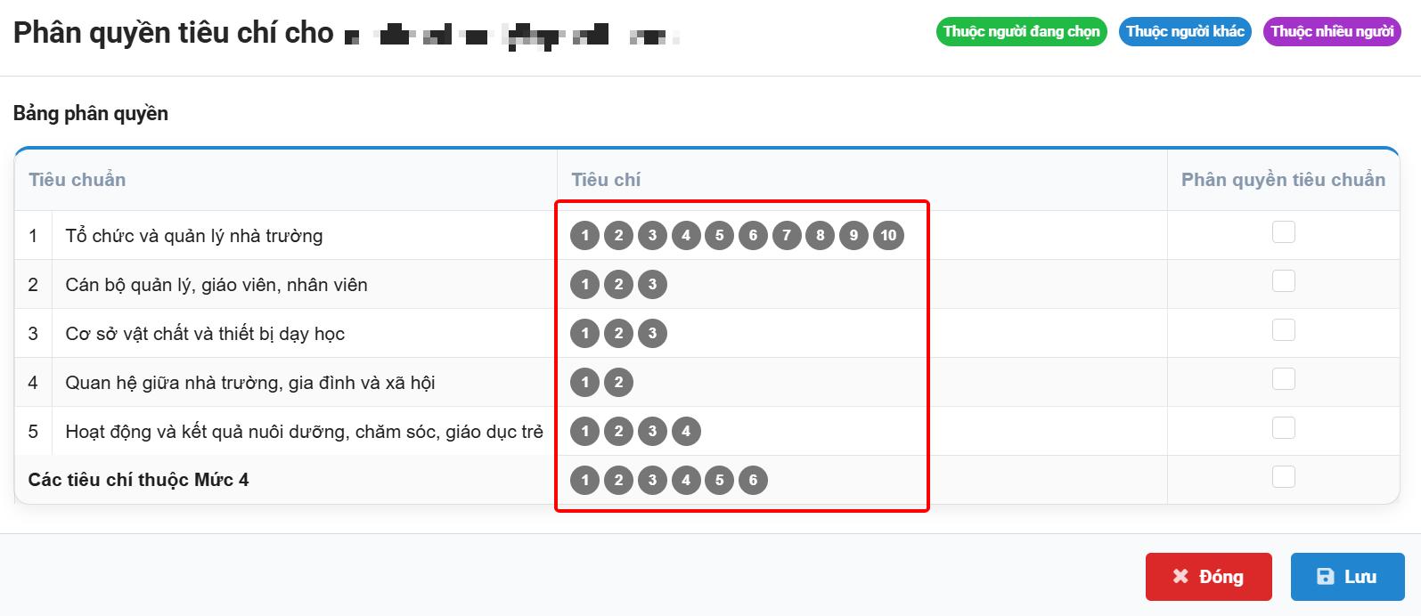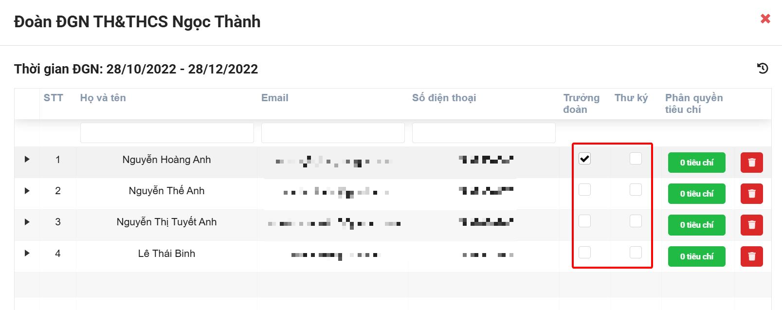 2. Phân quyền tiêu chí cho thành viên ĐGN (dành cho Trưởng đoàn)