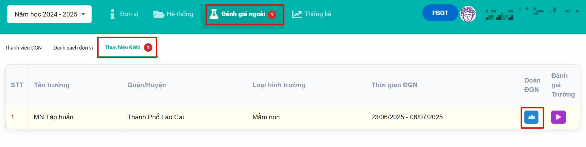 Bước 2: Vào menu Đánh giá ngoài → chọn mục Thực hiện ĐGN → bấm nút Đoàn ĐGN để truy cập phần phân công.