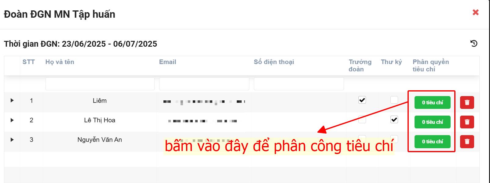 Tại bảng danh sách thành viên trong đoàn, tìm tới cột Phân quyền tiêu chí → bấm vào nút màu xanh lá tương ứng với từng thành viên.