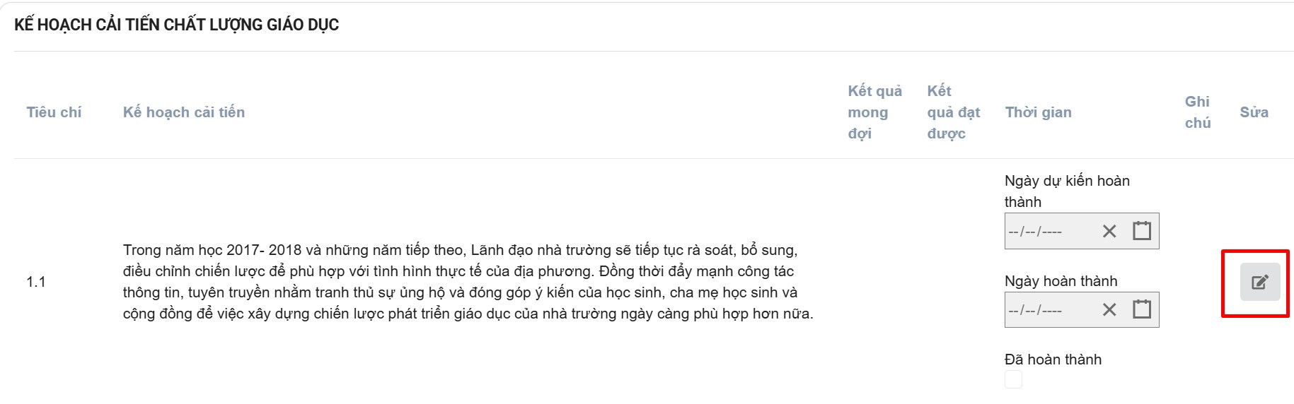 • Kết quả đạt được: Mức độ đã đạt được của trường đến thời điểm hiện tại.