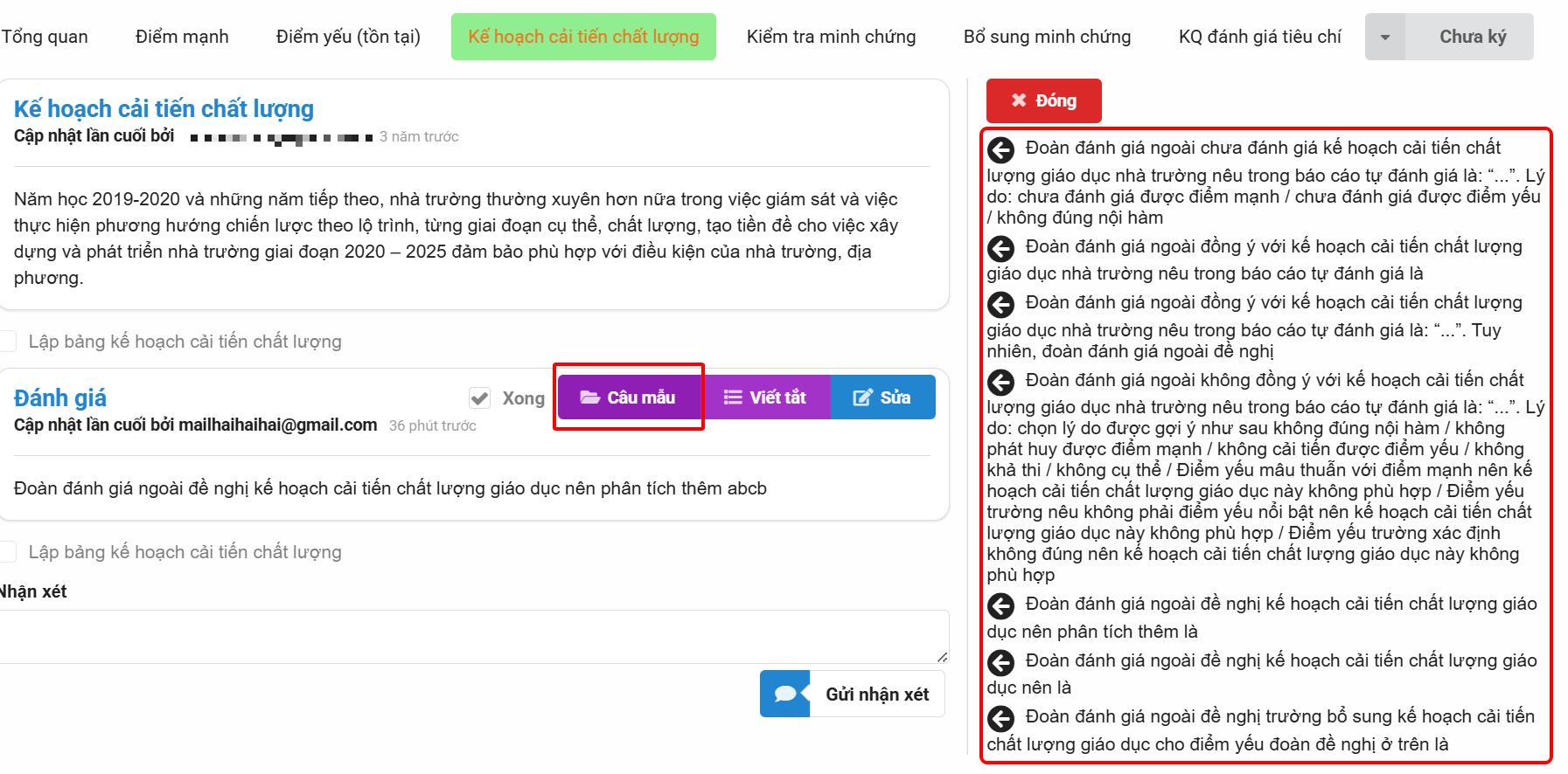 Gợi ýhoặcCâu mẫu(chỉ có tại PL9): Mở thư viện các đoạn đánh giá mẫu được gợi ý sẵn. Để sử dụng, Thầy/Cô bấm vào biểu tượng mũi tên bên cạnh câu mẫu để chèn nội dung vào ô nhập liệu.