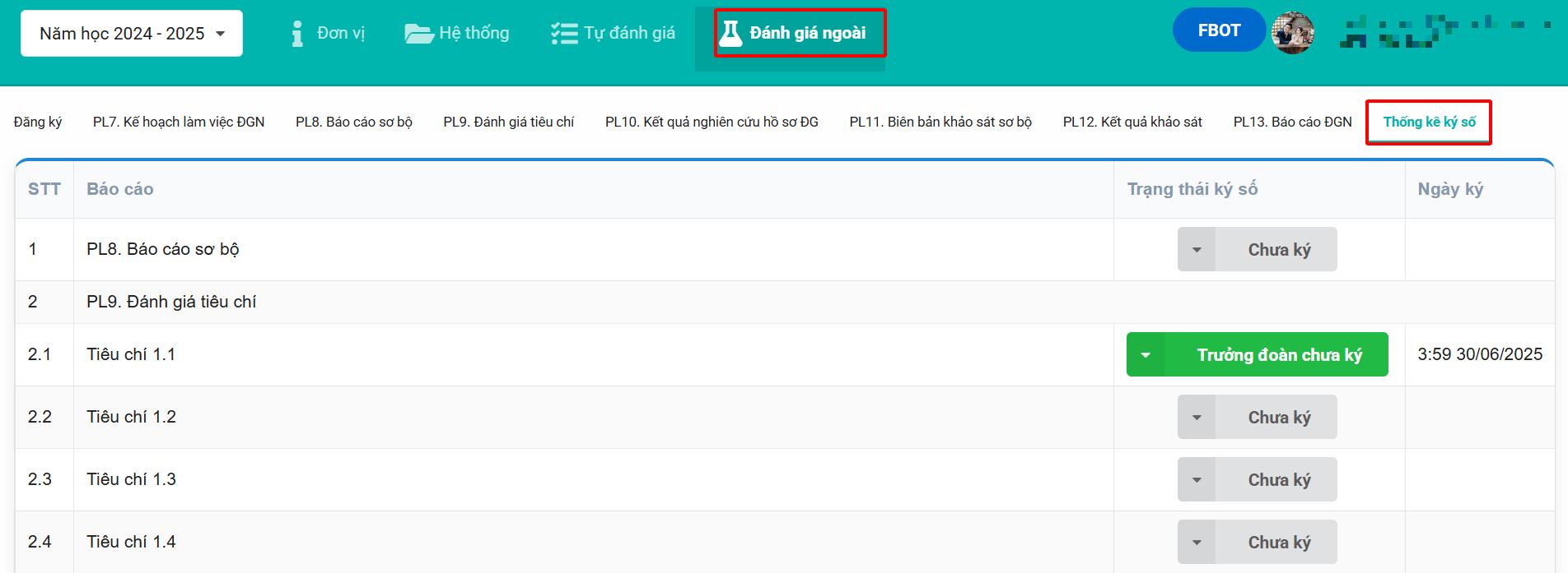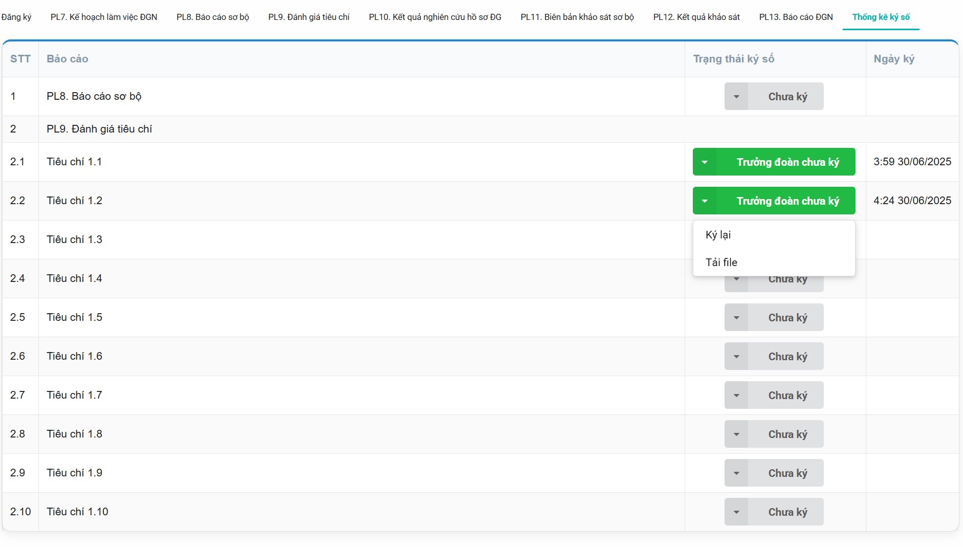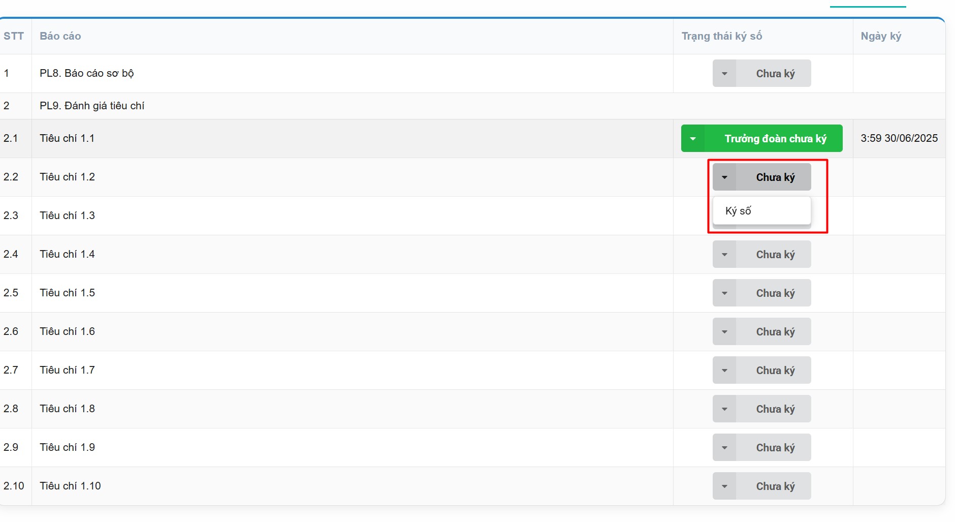Chưa kýsẽ chuyển thànhĐã ký. Đối với PL9, thành viên đánh giá và trưởng đoàn ký thì mới hiện nútĐã ký, nếu trưởng đoàn chưa chưa ký sẽ hiển thị nútTrường đoàn chưa ký - Nếu muốn ký lại (ví dụ do thay đổi nội dung), Thầy/Cô bấm vào