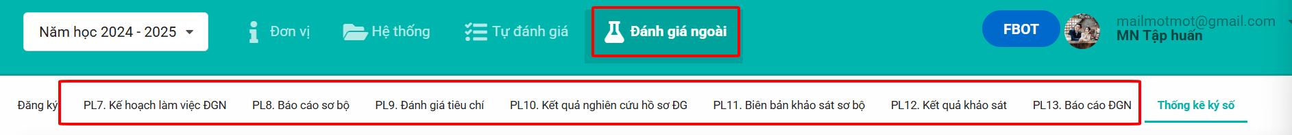 Vào menu Đánh giá ngoài → chọn phụ lục Thầy/Cô muốn ký (từ PL7 đến PL13)