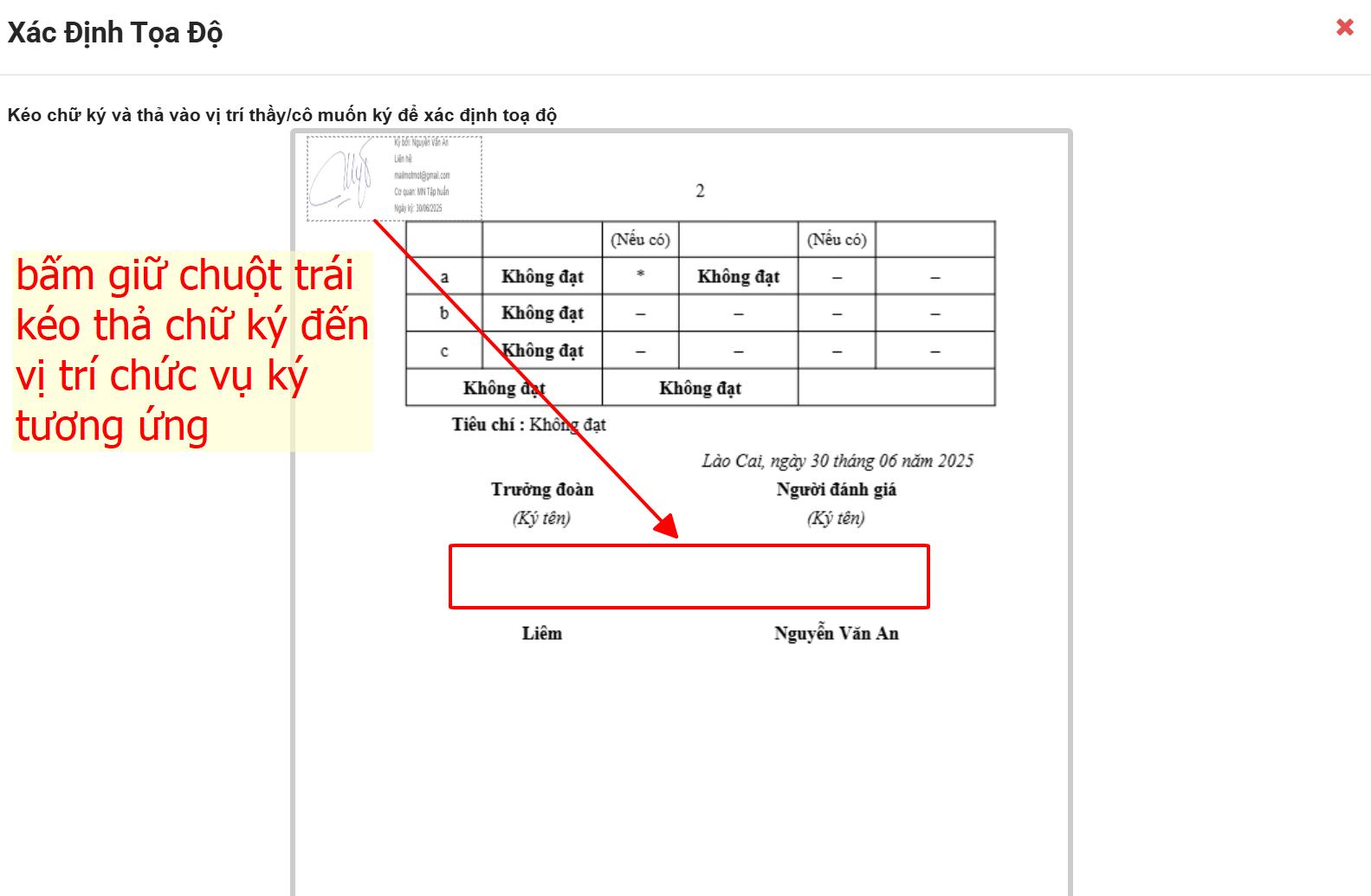 Xác định tọa độ - Giữ chuột trái → kéo và thả vùng chữ ký tại vị trí mong muốn trong trang văn bản.